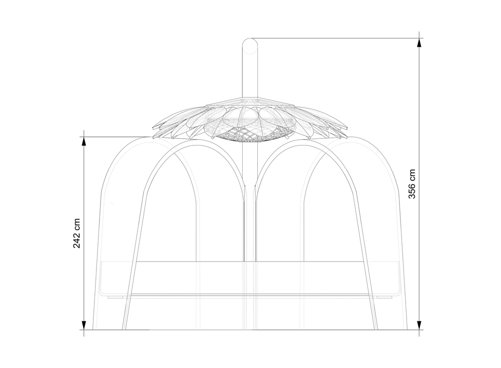 La parte superiore, è retta da un elemento cilindrico piantato a terra che va a curvarsi all'estremità, al fine di reggere la copertura formata da lamine in acciaio cor-ten sovrapposte, e unite tra di loro da una struttura tubolare posta al di sotto di esse. La copertura con le lamine in questo caso riprende quelli che in realtà sono i petali dei girasoli.