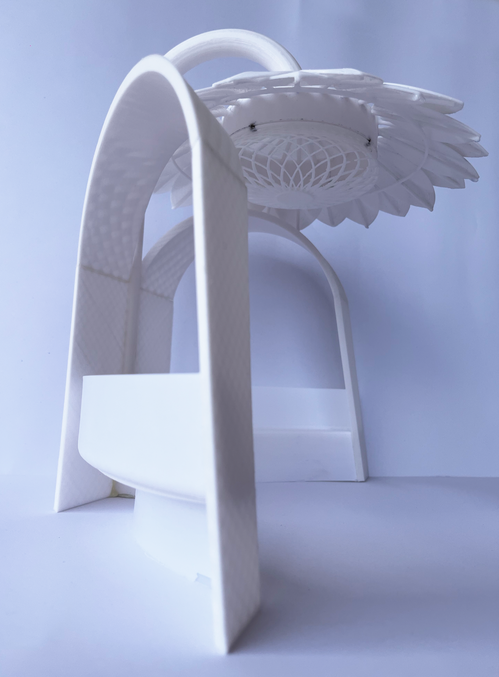 Per l'illuminazione si è scelto di ispirarsi alla struttura spiraliforme dei semi di girasole. Questo è stato possibile grazie alla progettazione di un elemento con la stessa struttura frattale, che permette di creare le ombre grazie alla luce utilizzata per l'illuminazione, creando così una proiezione di ombre sulla struttura e sull'ambiente circostante.